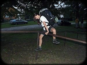 Další stanoviště nebylo soutěžní, tam se rozdávala polévka, tentokrát byla opravdu výborná. Pauza na oběd byla první větší zastávka našeho putování, když nepočítám tu hodinu u Babči, kde jsme strávili víc jak hodinu. Celkově jsme si nedělali vlastní přestávky, odpočívali jsme jen na stanovištích, ale jen chvíli než na nás přišla řada, a to nebylo dlouho, fronty jsme na žádném stanovišti neviděli. Soutěž měla několik stanovišť uvnitř obory a ostatní venku. Trasa okolo obory byla velice jednotvárná, cesta vedla pořád rovně, napravo byl plot obory a nalevo jehličnatý les, takhle to vypadalo snad tři kilometry, člověku se zdálo, že stojí na místě. Na stanovišti, kde byly přichystány lanové překážky se snad všichni vyblbnuli. Na stanovišti s vysíláním a přijímáním morseovky se naše skupina rozdělila na tři části (netahali jsme sirky ale rákos :-) ). Oba Martinové pracovali na mapě ČR, kterou dělili podle krajů, Pepa diktoval Hance tečky čárky, a ta je poté rukama ukazovala (na to jsem se nemohl dívat), Moniika diktovala Markovi tečky a čárky, ten je zapisoval. Poté co byla odeslána a přepsána zpráva u nás, pustil jsem se do luštění a úspěšně vyluštil zprávu. Martinům se úkol taky podařil, sice nebyl stoprocentní, ale rozhodně jsme odcházeli z tohoto stanoviště s pocitem dobře odvedené práce. O dalším stanovišti se to ale říct nedá. Nevím, kdo všechno se při hodu granátem trefil do terče, ale já mezi ně nepatřil. Mrzelo mě to dost, protože tohle byly zbytečně ztracené body. Velice netradiční stanoviště bylo jedno z posledních, všichni dostali na hlavu sluchátka a museli určit tři písmena z morseovky, které se neustále opakovala, poté museli dva dobrovolníci hledat dle intenzity zvuku vysílač. Nějaké body jsme tu získali, i když i já jsem měl problém, zjistit co se ze sluchátek ozývá, jedna čárka mi zněla spíš jak tečka, a tak místo písmena O jsem slyšel G, ale bylo mi napovězeno, že to jsou tři čárky. Pak už následovali stanoviště bez dozoru. Cestou na poslední stanoviště jsme se trochu minuli (opět problém s tolerancí stanoviště 300m). To už bylo na Hanku trochu moc, odmítala se kousek vracet, že na nás počká, bohužel to pravidla nedovalovala, takže chtě nechtě musela s námi. Nejdřív jsem ji popichoval já, poté i Martin, takže nakonec došla i na poslední stanoviště, kde jsme si prohlédli vojenskou techniku, nato vybrali tři dobrovolníky, kteří si měli zapamatovat co nejvíc věcí, které byly na stole. Zapamatovali jsme si ¾ věcí, což podle mě není špatné.