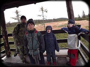 Ve večerních hodinách naší malou skupinu doplnili ještě kamarádi z tábora. Společně s nimi jsme v pátek vyrazili do Pece pod Sněžkou, abychom se odtud pokusili zdolat vrchol Černé hory, jež se tyčí do výše 1299 metrů nad mořem. Když jsme vystoupili z autobusu, tak nás zaskočilo zdejší chladno a slabá pokrývka sněhu. Nicméně ani to nás neodradilo a vyrazili jsme směrem k vrcholu. Po dřevěných chodníčcích jsme si prošli naučnou stezku Černohorské rašeliniště, jehož rozloha činí 66 ha a stáří se odhaduje až na neuvěřitelných 6000 let. Poobědvali jsme na Pardubických boudách, odkud jsme po sjezdovce zamířili dolů do Janských Lázní na Zlatou vyhlídku. Taktak jsme za tmi stihli objevit autobusovou zastávku a vrátit se zpátky na základnu. Večer ještě proběhl velkolepý turnaj ve střelbě z foukačky.