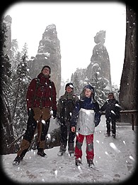 V sobotu brzy ráno jsme se probudili a za neuvěřitelné sněhové vánice zamířili vlakem do Adršpašsko-teplických skalních měst. Do skal jsme vstoupili z teplické strany a nejprve vystoupali na Střmen, zříceninu skalního hradu, jehož počátky sahají do 13. století. Prošli jsme si zdejší okružní cestu se svými 70 pojmenovanými skalními útvary a skrz Vlčí rokli se dostali do Adršpašských skal. Zde jsme obdivovali bezmála 100 metrů vysoké skalní věže, hluboké soutěsky, Myší díru, vodopády a jezírko. Dnešní den ve skalách byl úžasný, jelikož jsme tu v husté chumelenici skoro vůbec nikoho nepotkali a bloudili si tu sami.