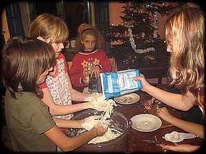 Po snídani vánočky s marmeládou šli kluci najít stromeček a holky ho pak ozdobily. Dopoledne jsme hráli různé hry a odpoledne jsme hráli Faraonovo oko. Kluci při hře dělali randál a strašili. Holky samořezně jako obvykle ječely. Pak jsme šli na procházku do lesa, a když jsme se vrátili, tak jsme napsali dopis Ježíškovi a mluvili ze sirkou. Potom jsme se pustili do naší štědrovečerní hostiny. Dělali jsme naše slavné langoše s neředěním česnekem. Když jsme osmažili a dopřipravili první pro holky, tak byly v pohodě. Ale poté, co si tam kluci dali hodně toho česneku, tak lítali po chatě, chladili vodou a strkali hlavu ven z okna, aby se zbavili strašného pálení na jazyku.