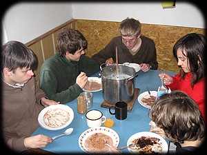 Předposlední den – čtvrtek, den kdy se nikomu nechtělo nic dělat. K snídani byla míchaná vajíčka. Dopoledne jsme ještě stihli zahrát pár her a poté se střídali v míchání krupicové kaše k obědu. Dlouho se nám nedařilo docílit zhoustnutí do poživatelné míry, takže z původního plánu, jet na výlet vlakem ve 13 hod. to skončilo tak, že jsme jeli až o dvě hodiny později. Jinak krupičná kaše mně velice chutnala. Po obědě jsem se šel s několika dalšími lidmi natáhnout po vydatném obědě. Martin mezitím s těmi akčnějšími umyl nádobí. Poté, co skončili, usoudili, že je čas vyrazit na výlet, ale nepočítali s tím, že někteří z nás budou schopni po obědě spát. Jim to, ale nevadilo a museli nás vzbudit. Po mnoha ,,sprostých slovech“ a prošení, že se nám nikam nechce, se nás snažili dostat ze spacáků násilím, což se jim nakonec podařilo. Museli jsme spěchat, abychom náš vlak stihli, a proto Martin vymyslel nejkratší cestu. Jak všichni dobře známe Martina a jeho zkratky, tato cesta možná byla nejkratší, ale za to nejneschůdnější, jakou jsem kdy šel – prudký kopec dolů a ještě k tomu polom. Po té, co jsme našli cestu, se šlo mnohem snáze. Na vlak jsme nečekali ani moc dlouho. Projeli jsme tři zastávky a vystoupili, dojeli jsme k cíli – strašný hrad Furchtenberg neboli Nový hrad u Kopřivnice. Po třičtvrtě hodině chůze do kopce jsme dorazili k hradu. Vláďa byl unešen, protože zde trávil tři dny v létě a všechny nás tu mohl provést jako pravý kastelán. Hrad se skládal z rozpadlých zdí a částečně stojících věží. Pěkně jsme si to prošli a vydali se zpět na vlak. Cestu na hrad a na nádraží jsme stihli během 1,5 hodiny. Na zastávce jsme se dostali k tomu, že jsme Martinovi popřáli k jeho dnešním narozeninám, což ho velice potěšilo. Cesta vlakem zpět také rychle utekla. Po vystoupení z vlaku se Martin rozhodl (jak rozhodl?, byl přinucen!), že hodinu nebude mluvit. Někteří další se k němu přidali, takže jsem musel zastat mluvení všech, to znamenalo, že se mi huba téměř nezastavila. Zpáteční cestu jsme zvolili jinudy, Pepova GPS navigace nám v tom dosti pomohla. Martin dodržel slovo a celou jednu hodinu nepromluvil. Do chaty jsme došli potmě a v husté mlze. Všichni unaveni, ale šťastni, že jsme to přežili. Před večeří pro nás Martin připravil poháry na oslavu svých narozenin, na kterých jsme si pochutnali. K večeři jsme si naplánovali udělat křapáče, což jsme taky udělali. Poslední večer před odjezdem, jsme si docela zařádili s nafukovacími balonky, u kterých jsme se definitivně unavili.